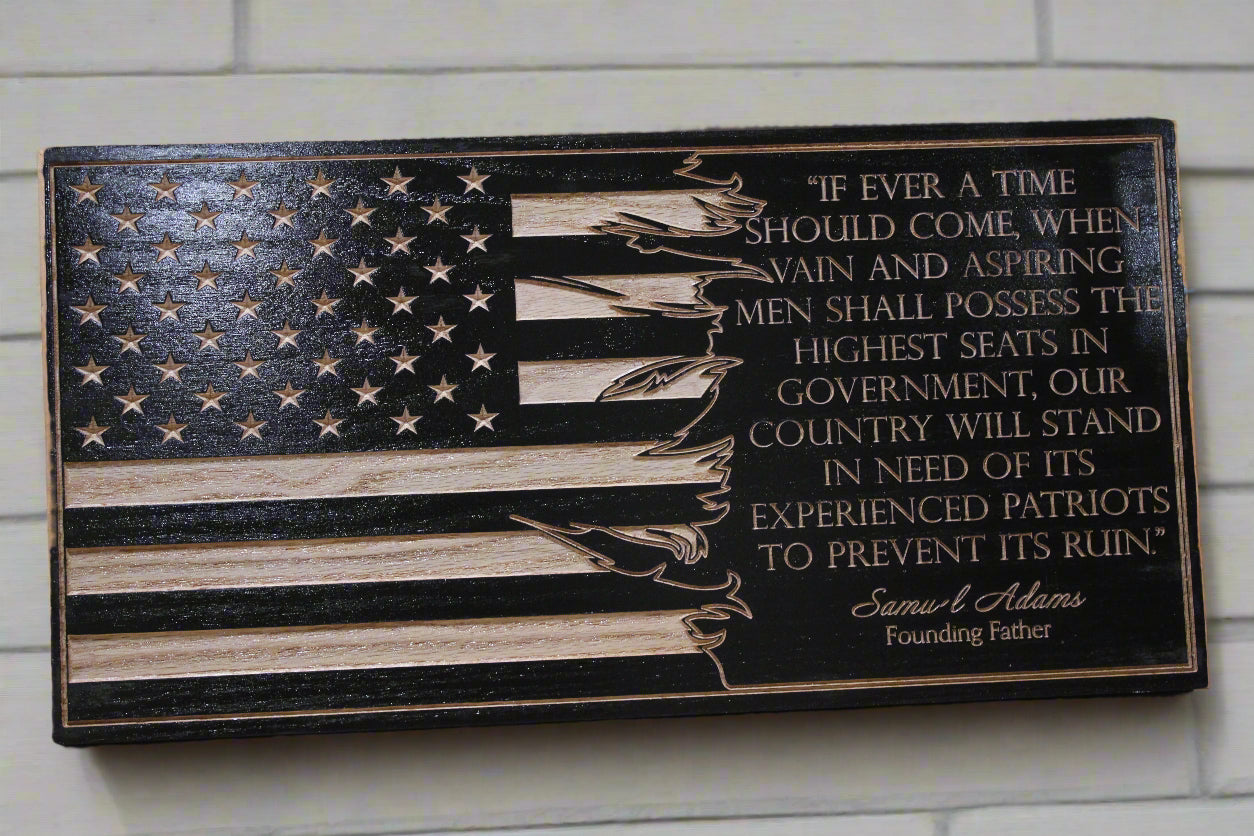 Celebrate your patriotism with our Carved Edmund Burke Quote Flag! This tattered flag measures 11.25 by 22 inches and proudly displays a quote from the influential statesman Edmund Burke. Let his words inspire you with a sense of duty and love for your country. Perfect for any proud American.