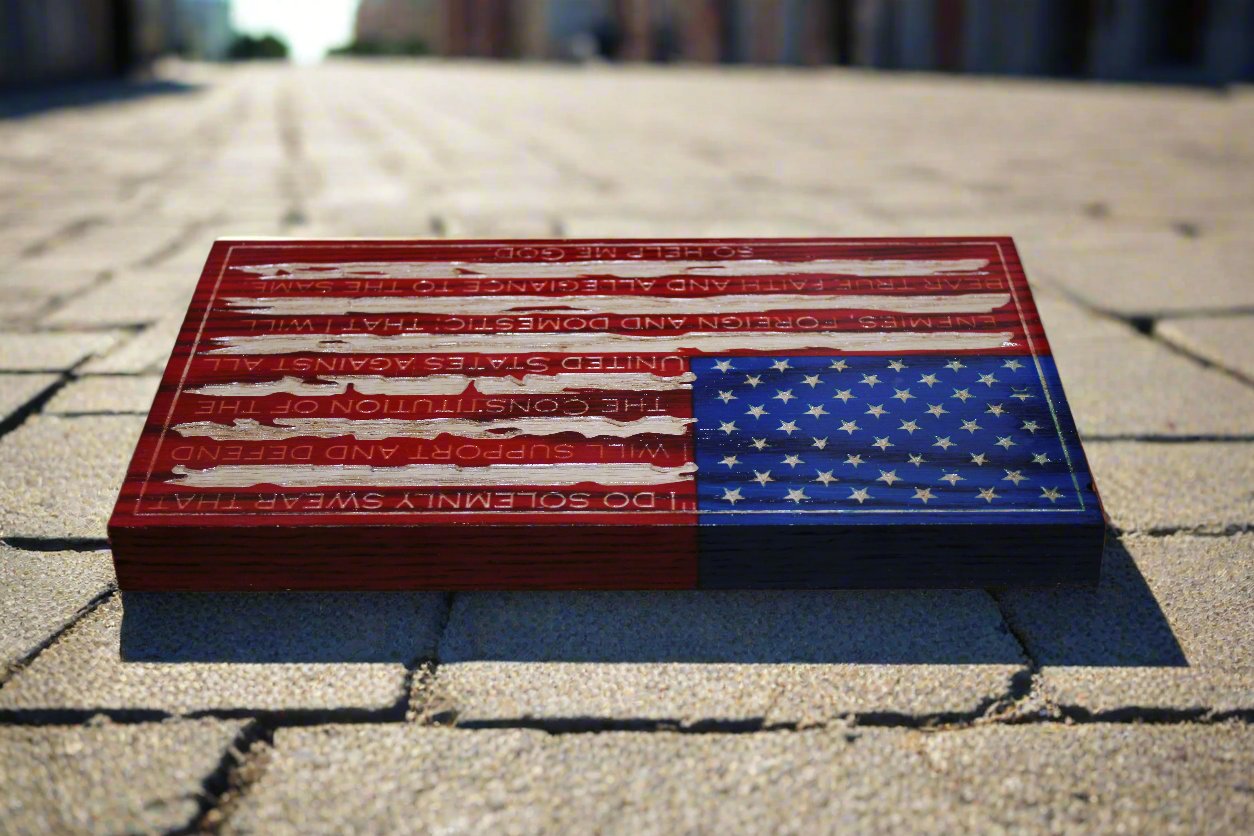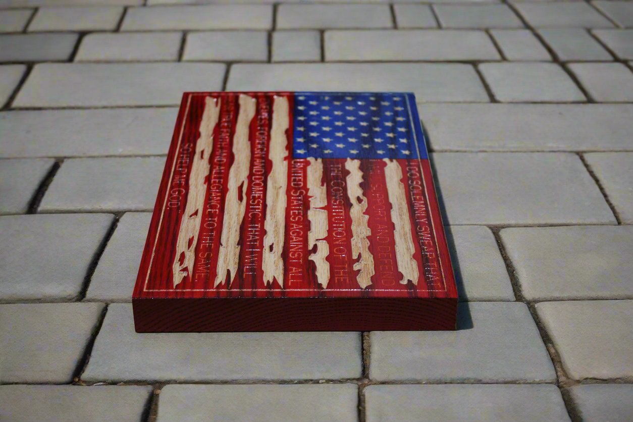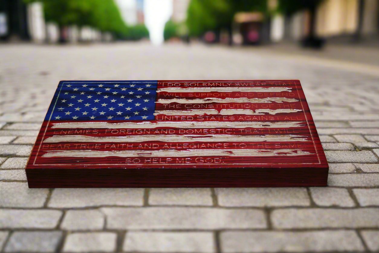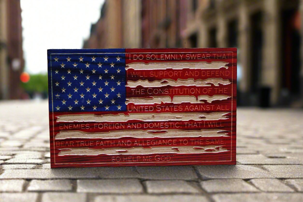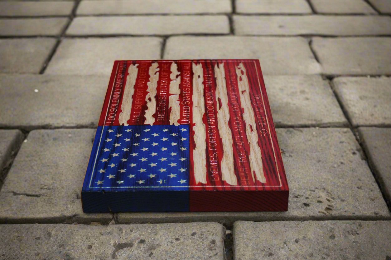 Loyal patriots, behold the Small Carved Oath Of Enlistment Flag! Crafted from Red Oak wood, this 7x11 inch flag showcases the sacred oath of our brave soldiers. Honor their sacrifice and show your support with this inspiring piece that will add a touch of patriotism to any room.